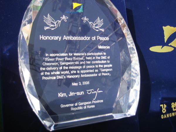 She was given her own plaque wich made her an honorary ambassador of peace